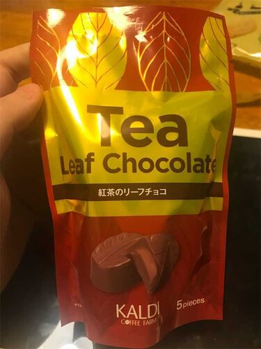 へいす。 今日のもカルディの新商品やで。 「紅茶のリーフチョコ」です。 こちらも5個入りで297円と強気の価格設定。 流石に高すぎませんかねぇ? コストかかってるのかな? ま、期待して食べましょ。 もぐり… んー? 普通の美味しいミルクチョコ…? 紅茶が…