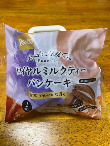 へいす。 今日のはドラッグストアで見つけました。 税抜きで98円。安い! 「Pasco・ロイヤルミルクティーパンケーキ」です。 2個入りだって。 パンケーキがそもそも紅茶風味で そこにロイヤルミルクティークリームと ミルクホイップクリームが入ってる贅沢っ…